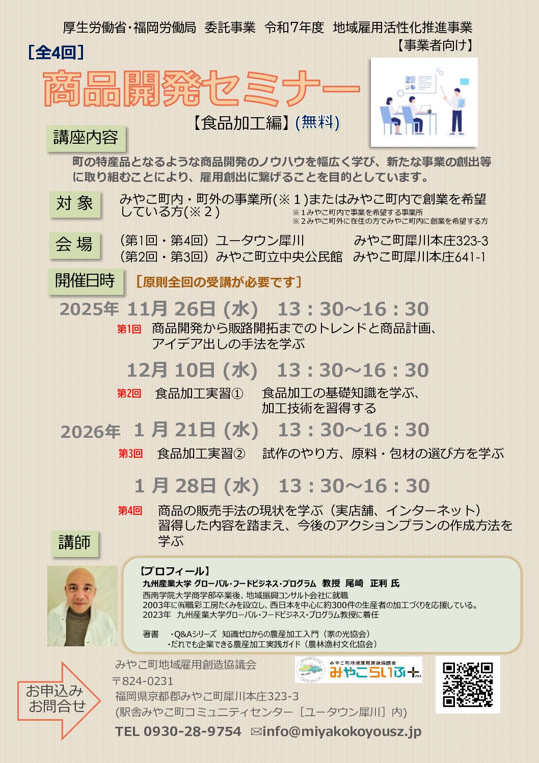 町の特産品となるような商品開発のノウハウを幅広く学び、新たな事業の創出等に取り組むことにより、雇用創出に繋げることを目的としています。